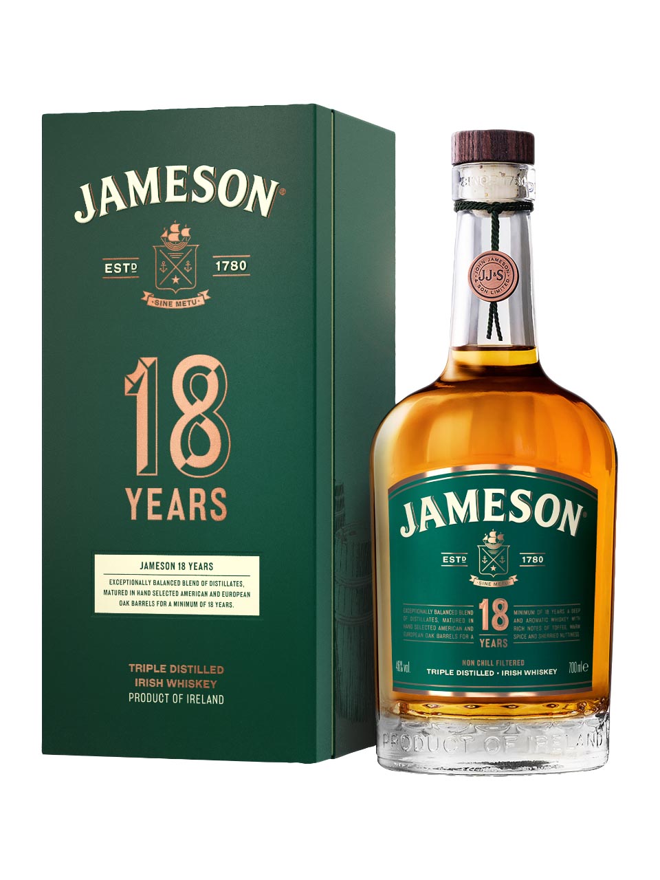Jameson 18 Years Old is a mellow tasting rare old whiskey matured for at least 18 years in hand selected American barrels and European oak casks. They are finished in first-fill bourbon barrels where they complete their rite of passage and add subtle traces of vanilla on the palate. Once matured to perfection, the result is an exceptionally balanced whiskey with a mellow complex taste and lingering finale of wood, spice and toffee
